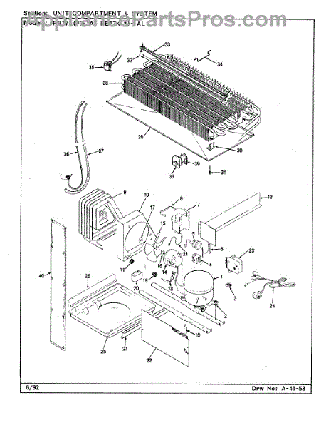 Plastic defrost pan. Evaporator pan hangs from side rails and rests on compressor.