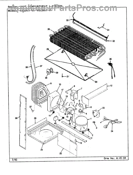 Plastic defrost pan. Evaporator pan hangs from side rails and rests on compressor.
