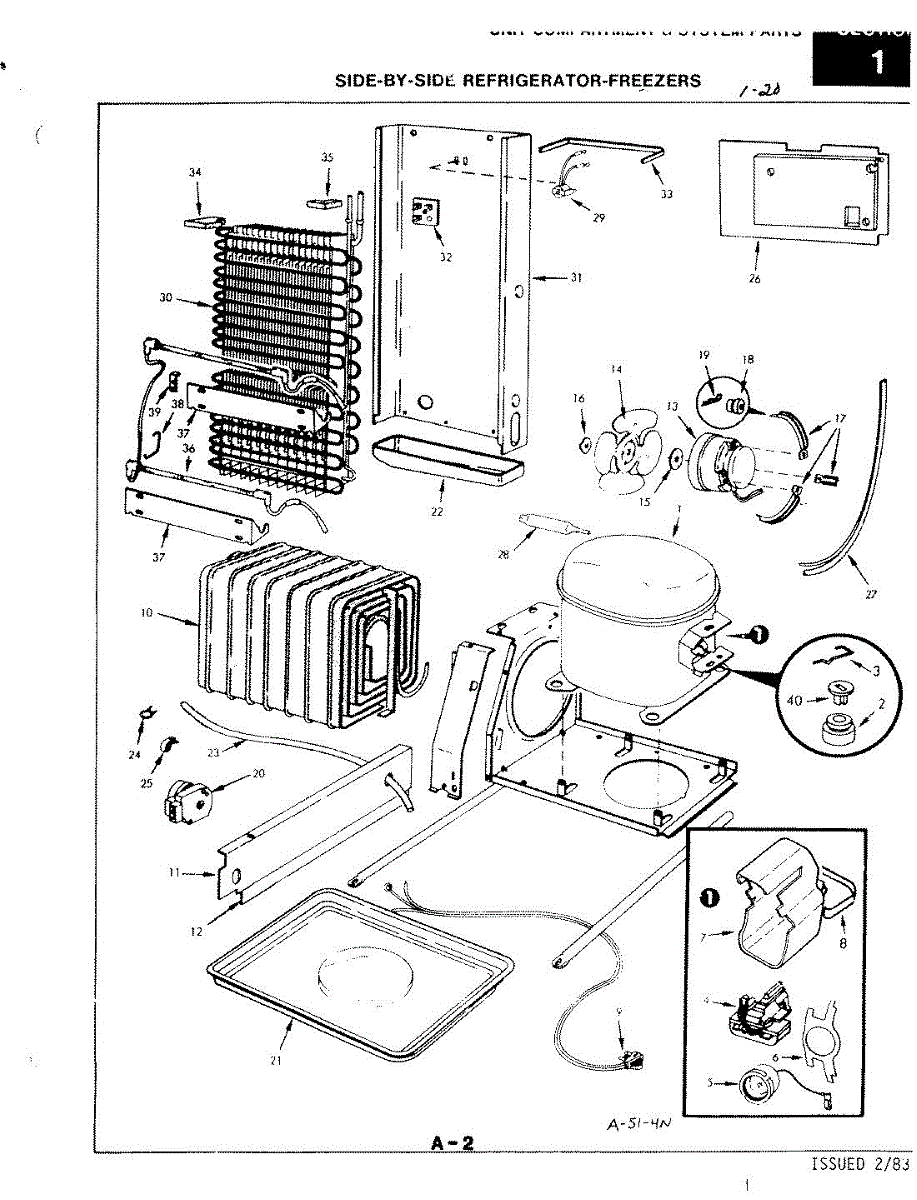 Plastic defrost pan. Evaporator pan hangs from side rails and rests on compressor.