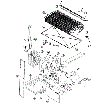 Plastic defrost pan. Evaporator pan hangs from side rails and rests on compressor.