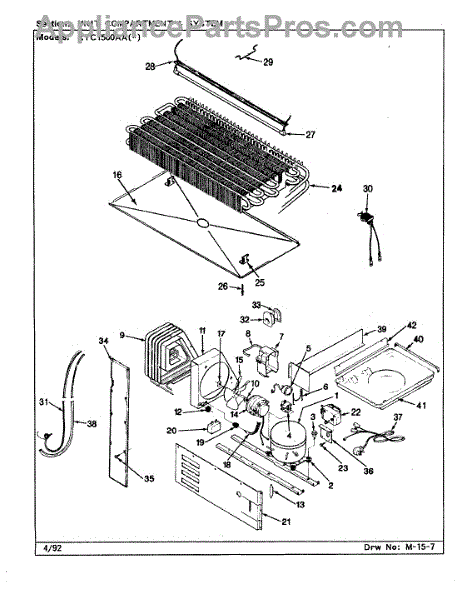 Plastic defrost pan. Evaporator pan hangs from side rails and rests on compressor.