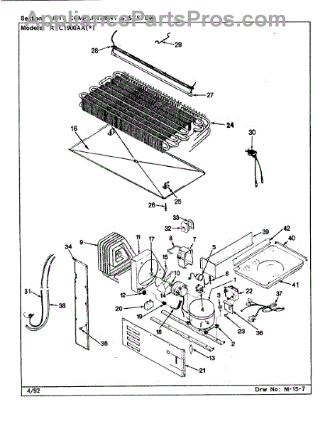 Plastic defrost pan. Evaporator pan hangs from side rails and rests on compressor.