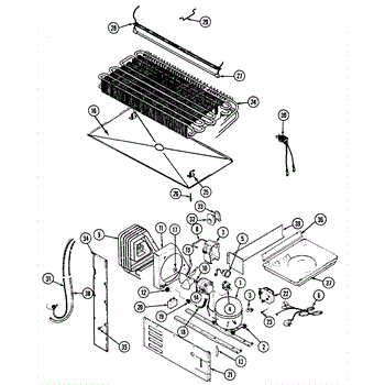 Plastic defrost pan. Evaporator pan hangs from side rails and rests on compressor.