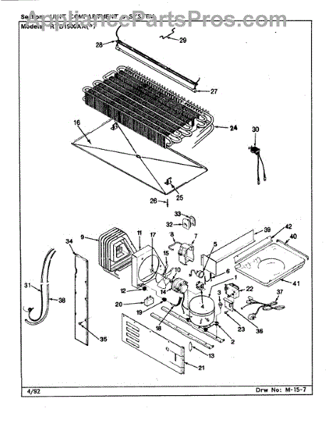 Plastic defrost pan. Evaporator pan hangs from side rails and rests on compressor.