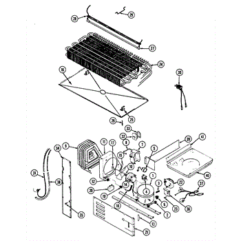 Plastic defrost pan. Evaporator pan hangs from side rails and rests on compressor.