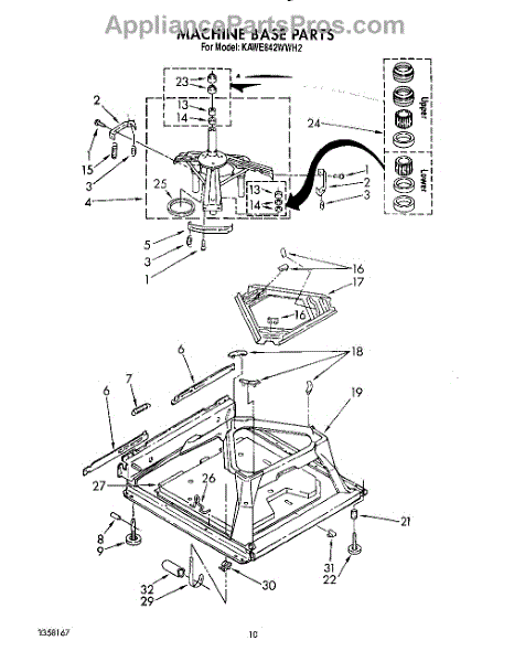 Used for direct drive washing machines. Complete assembly includes 2 level mechanism links, 1 level mechanism spring, 1 knurled pin, 2 rear feet, 1 pad plate, 1 suspension plate, 1 base pad, and 1 suspension spring retainer.