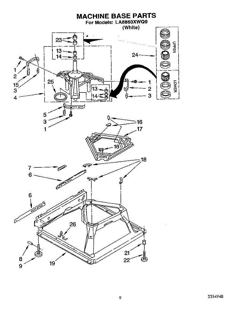 Used for direct drive washing machines. Complete assembly includes 2 level mechanism links, 1 level mechanism spring, 1 knurled pin, 2 rear feet, 1 pad plate, 1 suspension plate, 1 base pad, and 1 suspension spring retainer.