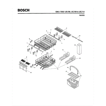 The Silverware Basket Assembly is an OEM part for Bosch dishwashers. This basket is located in the lower rack and is used to hold utensils securely during the wash cycle.