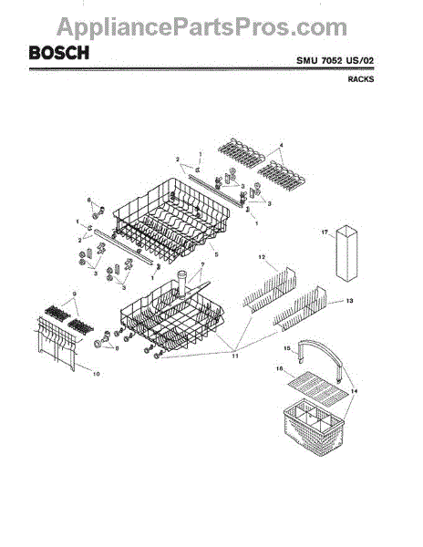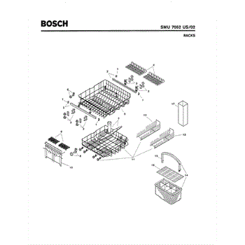 The Silverware Basket Assembly is an OEM part for Bosch dishwashers. This basket is located in the lower rack and is used to hold utensils securely during the wash cycle.
