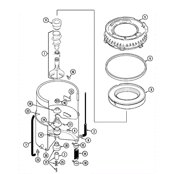 This tub cover and gasket seal the top of the outer tub to contain splashing and prevent leaks during wash and spin. Replacing a cracked cover or compressed gasket restores a tight rim seal and cleaner operation. What it does: