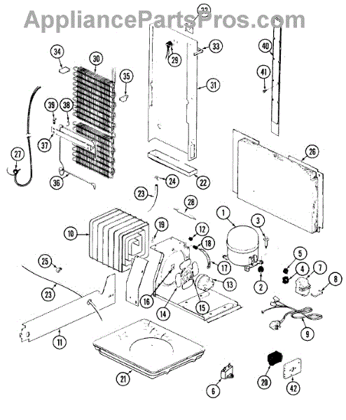 Plastic defrost pan. Evaporator pan hangs from side rails and rests on compressor.