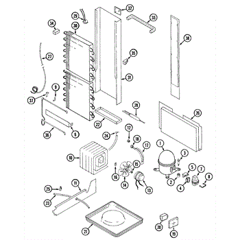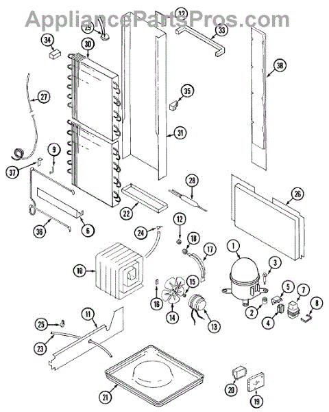 Plastic defrost pan. Evaporator pan hangs from side rails and rests on compressor.