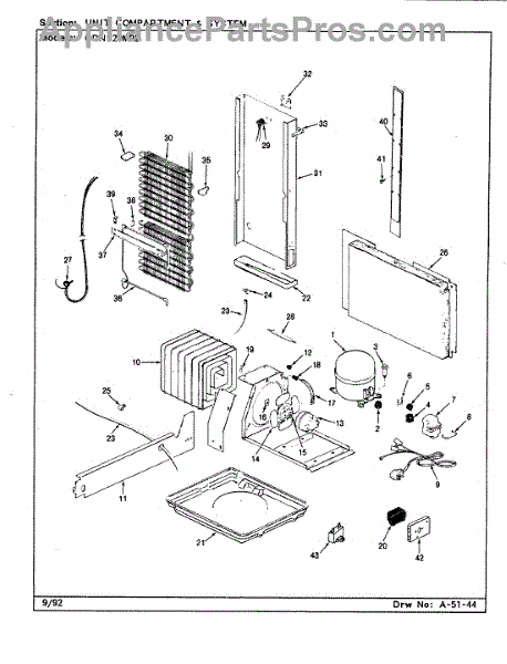 Plastic defrost pan. Evaporator pan hangs from side rails and rests on compressor.