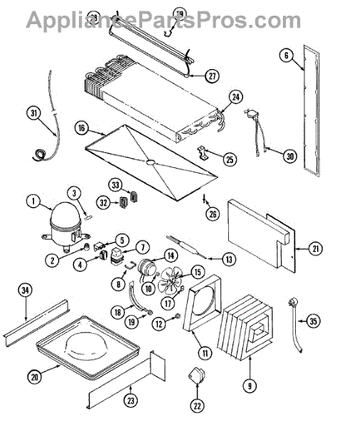 Plastic defrost pan. Evaporator pan hangs from side rails and rests on compressor.