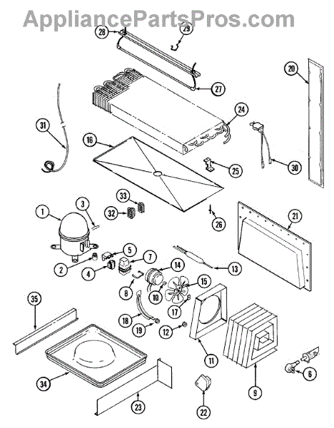 Plastic defrost pan. Evaporator pan hangs from side rails and rests on compressor.