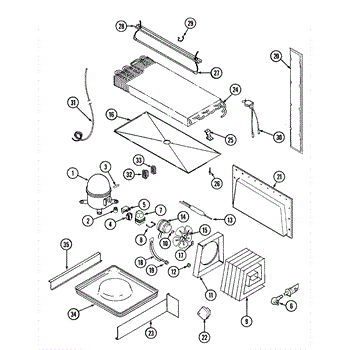 Plastic defrost pan. Evaporator pan hangs from side rails and rests on compressor.
