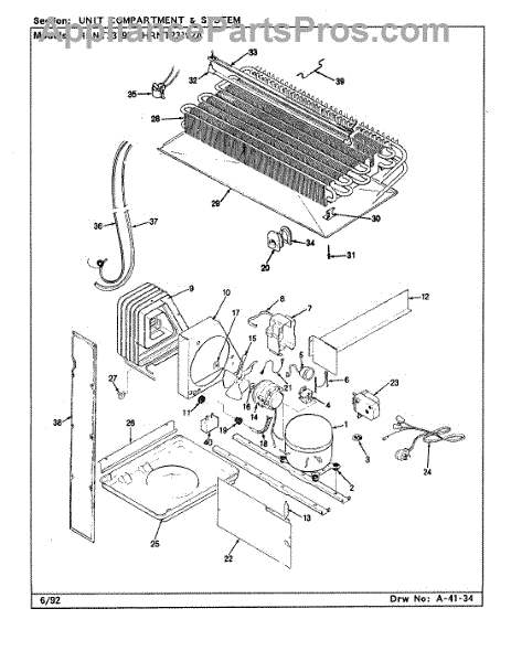 Plastic defrost pan. Evaporator pan hangs from side rails and rests on compressor.