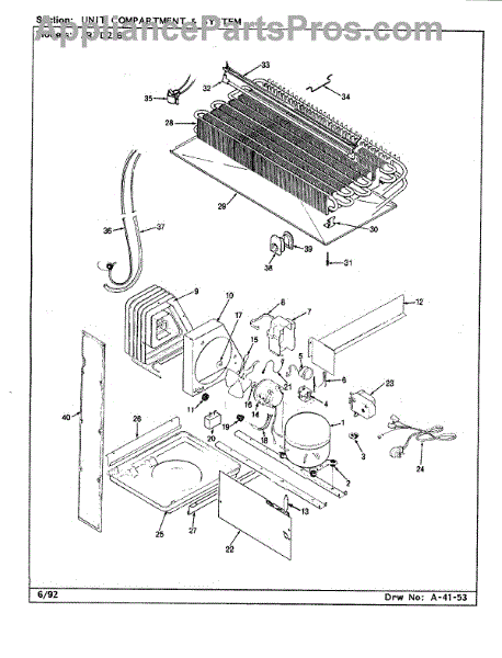Plastic defrost pan. Evaporator pan hangs from side rails and rests on compressor.