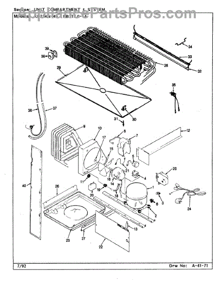 Plastic defrost pan. Evaporator pan hangs from side rails and rests on compressor.