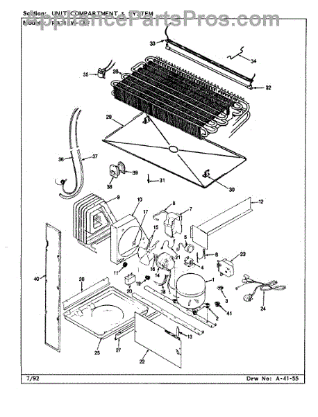 Plastic defrost pan. Evaporator pan hangs from side rails and rests on compressor.