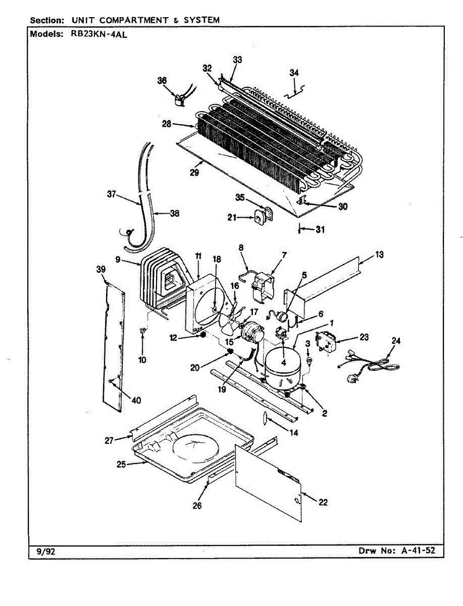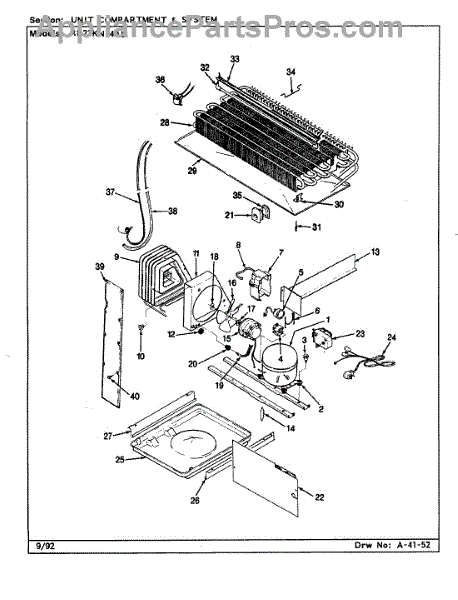Plastic defrost pan. Evaporator pan hangs from side rails and rests on compressor.