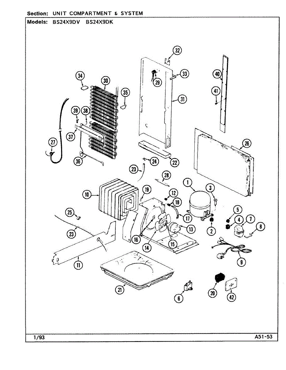 Plastic defrost pan. Evaporator pan hangs from side rails and rests on compressor.