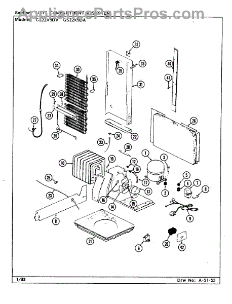 Plastic defrost pan. Evaporator pan hangs from side rails and rests on compressor.