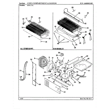 Plastic defrost pan. Evaporator pan hangs from side rails and rests on compressor.