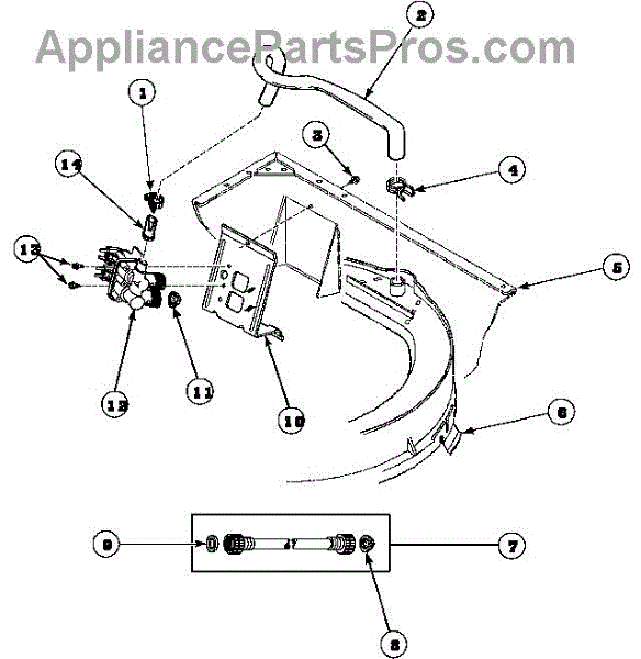This small strainer sits inside the washer's water inlet valve and screens out sand, rust, and sediment from the supply lines. Replacing a clogged or missing screen restores normal fill flow and helps protect the valve.