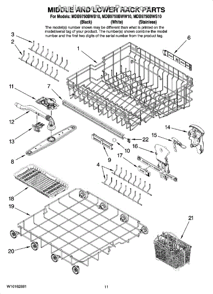 Dishwasher silverware basket includes both halves. Color: gray. Measures about 8 inches wide by 9-1/2 inches high by 12 inches deep.