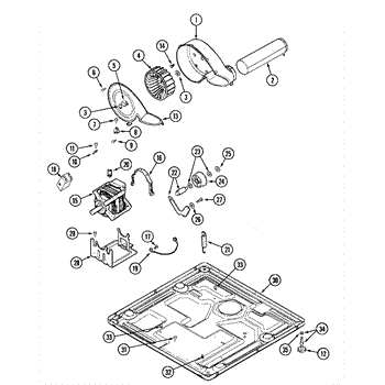 This dryer blower housing encloses the blower wheel and directs air from the drum through the lint filter to the exhaust vent. Replacing a damaged housing restores proper airflow for consistent drying and helps keep lint contained within the airflow path.