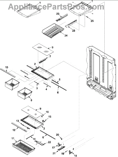 The Crisper Shelf Frame is an OEM part for Whirlpool side-by-side refrigerators. It provides sturdy tracked support for organizing vegetables and other produce items in the crisper drawers. The glass and center support are NOT included and must be ordered separately.