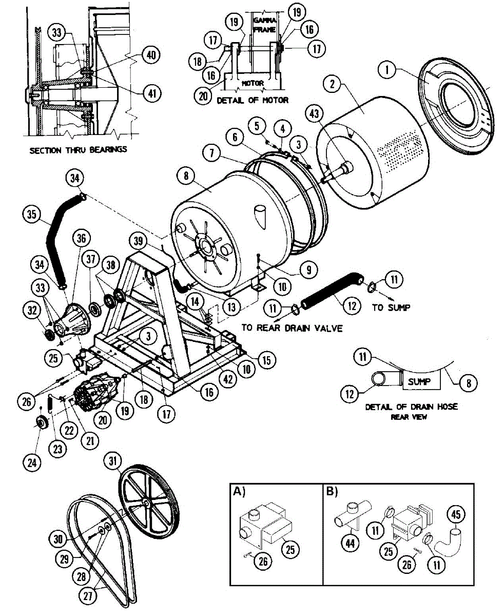Trunnion assembly kit for washers. Mounts the drum to the chassis and allows rotation. Replace if cracked, damaged, or causing excessive movement.