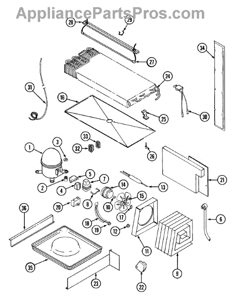 Plastic defrost pan. Evaporator pan hangs from side rails and rests on compressor.