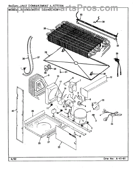 Plastic defrost pan. Evaporator pan hangs from side rails and rests on compressor.