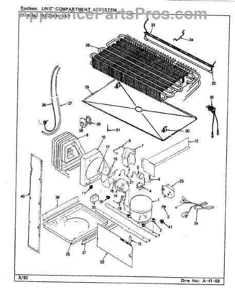 Plastic defrost pan. Evaporator pan hangs from side rails and rests on compressor.