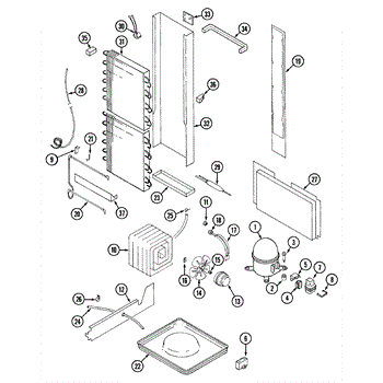 Plastic defrost pan. Evaporator pan hangs from side rails and rests on compressor.