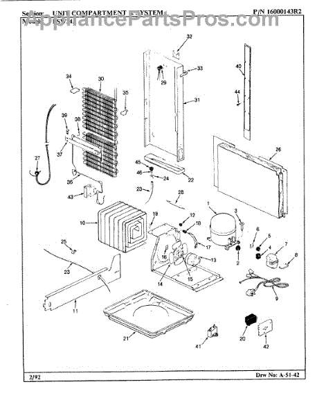 Plastic defrost pan. Evaporator pan hangs from side rails and rests on compressor.
