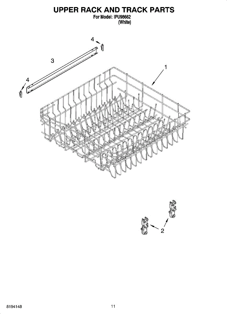 Replacement upper dishrack for dishwashers. Holds dishes, glasses, and utensils during wash cycles. Replace if rusted, cracked, or broken tines damage items.