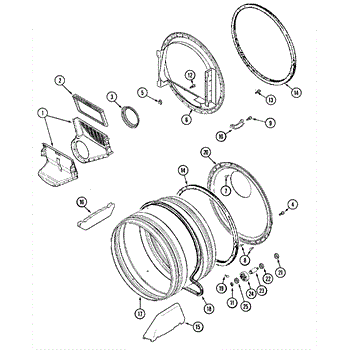 Seals the drum edge to prevent hot air escape and reduce noise. Replace when worn to eliminate metal-on-metal sounds or clothing stains. Confirm fit.