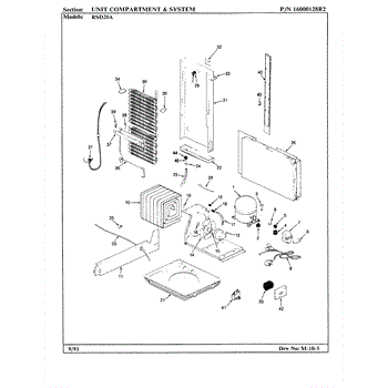 Plastic defrost pan. Evaporator pan hangs from side rails and rests on compressor.