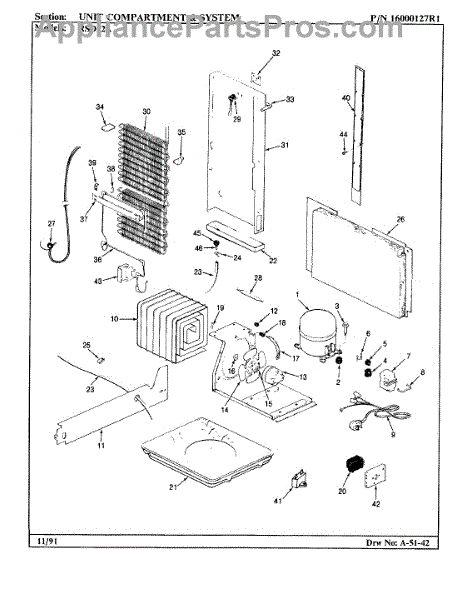 Plastic defrost pan. Evaporator pan hangs from side rails and rests on compressor.