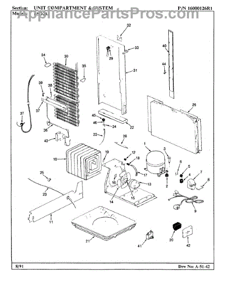 Plastic defrost pan. Evaporator pan hangs from side rails and rests on compressor.