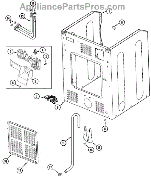 This small strainer sits inside the washer's water inlet valve and screens out sand, rust, and sediment from the supply lines. Replacing a clogged or missing screen restores normal fill flow and helps protect the valve.