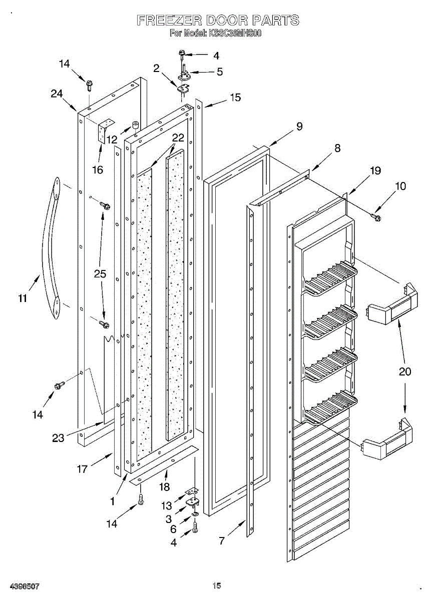 This screw is used to secure the handle end cap to the center of the door. The screw size measures 8-18 x 1/2 inches.
