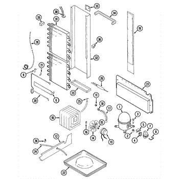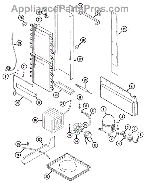Plastic defrost pan. Evaporator pan hangs from side rails and rests on compressor.