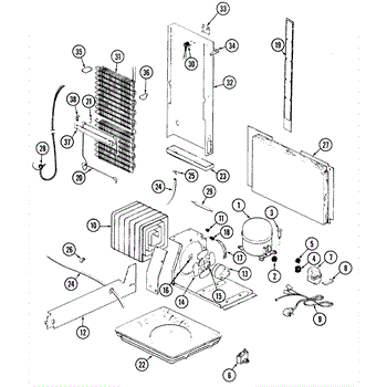 Plastic defrost pan. Evaporator pan hangs from side rails and rests on compressor.