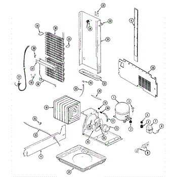 Plastic defrost pan. Evaporator pan hangs from side rails and rests on compressor.