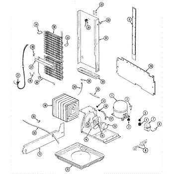 Plastic defrost pan. Evaporator pan hangs from side rails and rests on compressor.