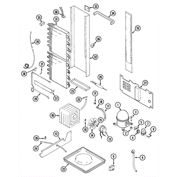 Plastic defrost pan. Evaporator pan hangs from side rails and rests on compressor.